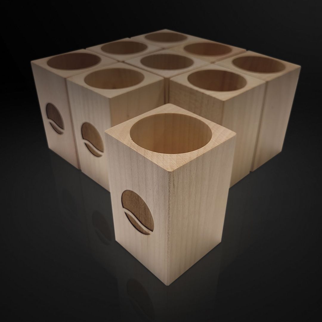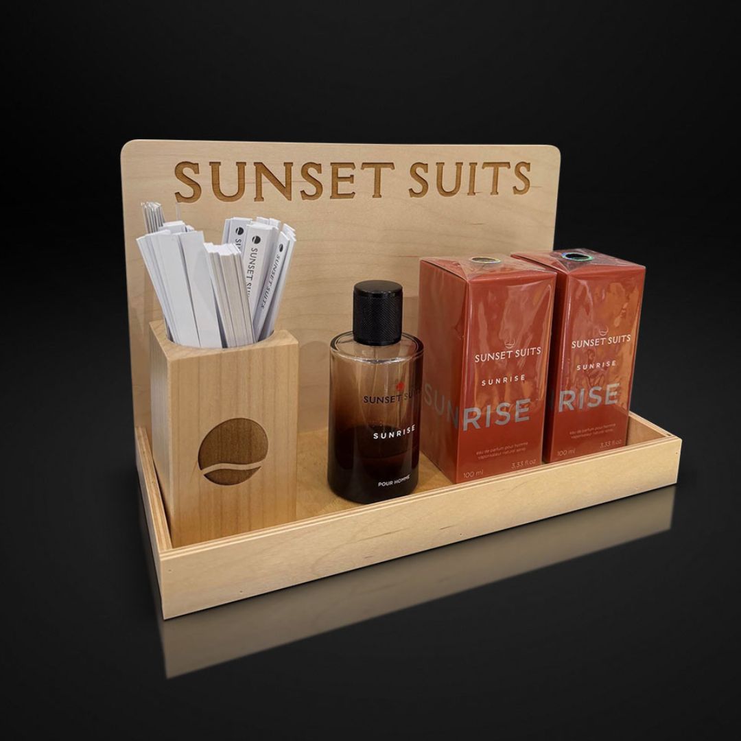 Wybór materiału podkreśla ekologiczny i ponadczasowy charakter ekspozytora, a jednocześnie zapewnia jego trwałość oraz wysoką estetykę wykonania. Konstrukcja ekspozytora POS nawiązuje do detalu w postaci drewnianej nakrętki flakonu, dzięki czemu całość tworzy spójną i harmonijną kompozycję materiałową oraz wizualną.